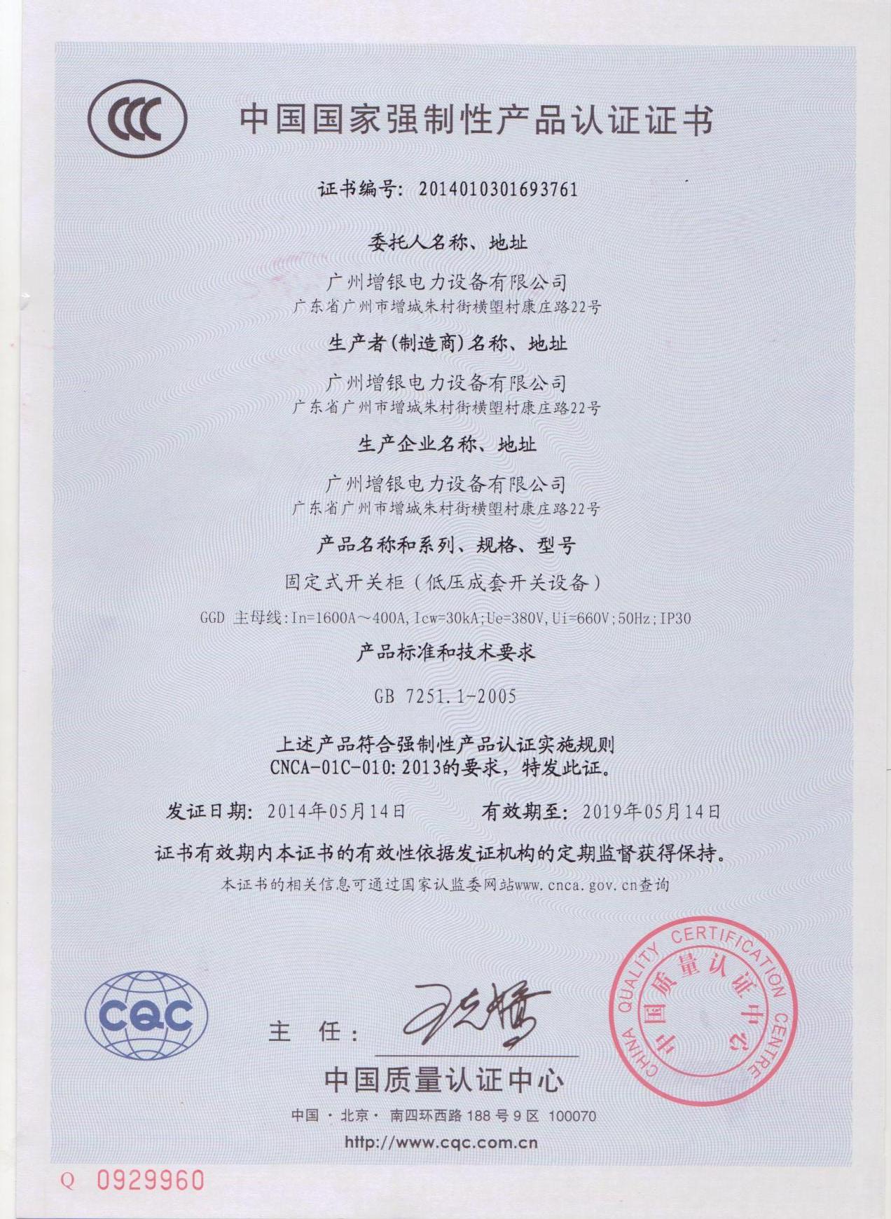 GGD开关柜CCC认证证书